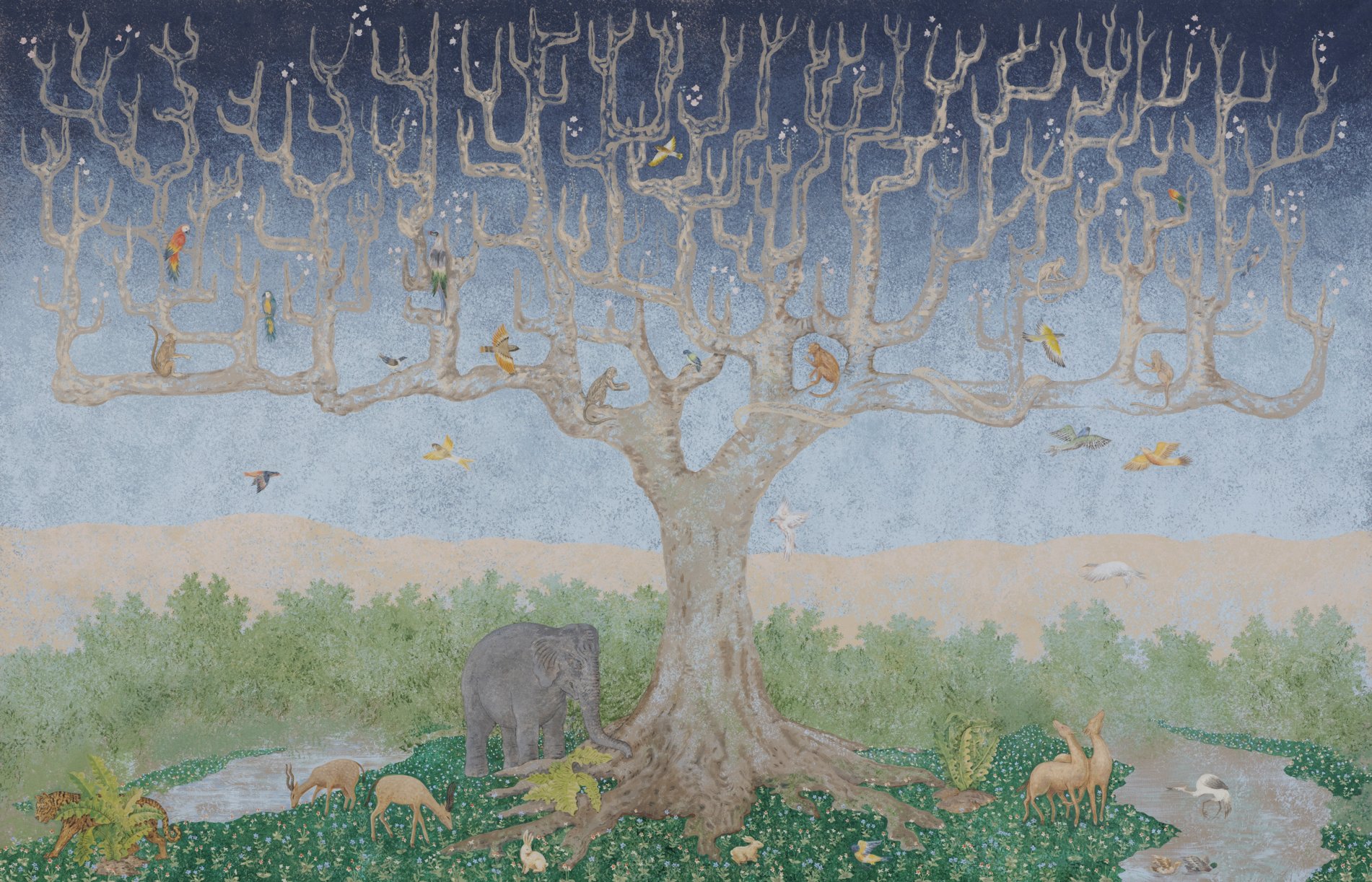Inspired by the stair hall mural painting in the late Queen Elizabeth’s intricate dollhouse designed by Sir Edwin Luytens, The Tree of Life was created as a multi-paneled wall mural depicting a scene featuring a genealogical tree adored by flora and fauna. The animals frolic together in a peaceful landscape speckled with white flowers, delicate plants, and gentle streams.